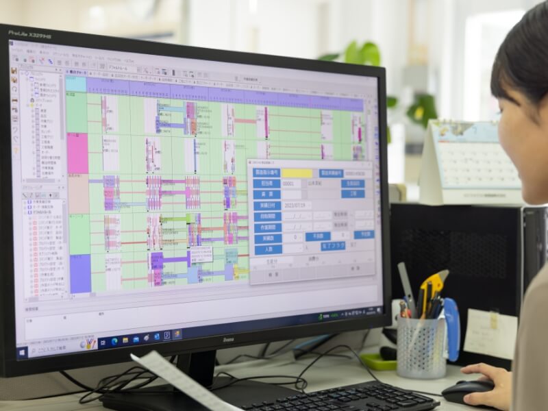 生産性の効率を考え、納期を確実に守るために、生産の肝でもある「計画」を重要視しております。そこで「生産管理システム」と「生産スケジューラー」を導入し、日々変動する要因、要求への対応、工場全体の